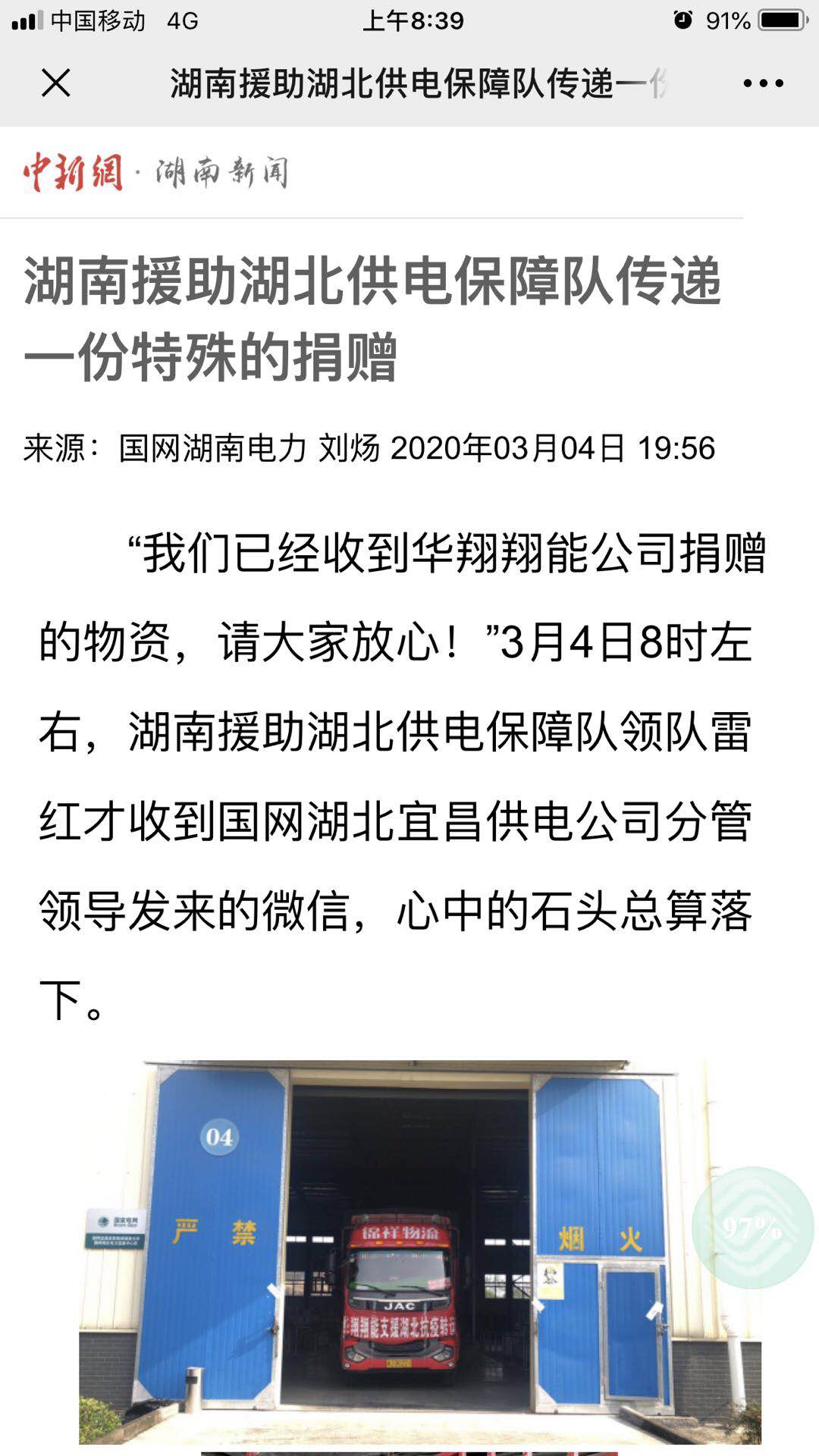 面对媒体采访时,公司副总经理黄向荣说道:“一方有难,八方支援。当我看到了国网湖南公司孟董事长连线援鄂队员这个报道,我突然觉得我们华翔翔能电气股份有公司应该做些什么,方能体现我们企业的社会责任与担当,顺着报道几经周折联系到了湖南电力援鄂电力保障队的同志,并向他们说明了我公司有捐赠的想法,请他们帮助联系当地电力部门,看看需要些什么物质,几十分钟后,国网湖北宜昌供电公司打电话说急需几台变压器和防疫物质。我们在一天时间筹集物质、调度车辆,即日启程前往湖北宜昌。祝愿我们的工作人员一路顺风,祝愿疫区人民平平安安、健健康康,早日结束疫情。”