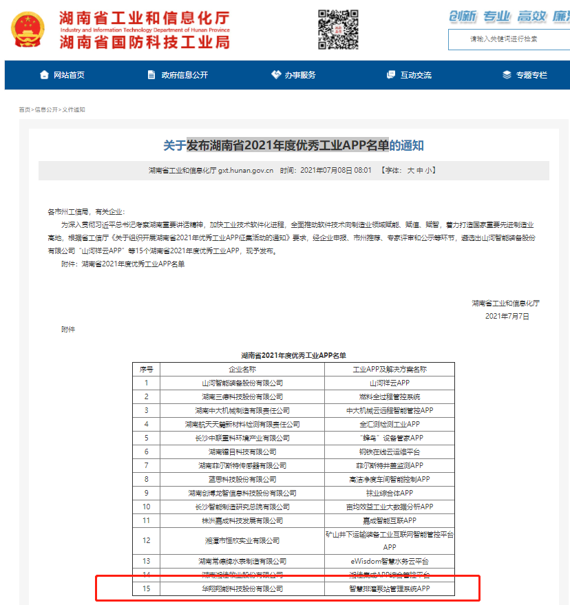 2021年7月7日,湖南省工业和信息化厅发布湖南省2021年度优秀工业APP名单,我司“智慧排灌泵站管理系统APP”成功入选。