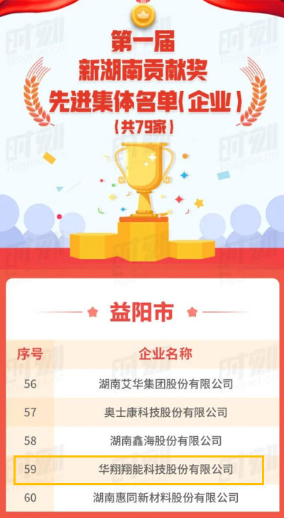 12月28日,湖南省人民政府举行首届“新湖南贡献奖”发布会。湖南省副省长何报翔发布《中共湖南省委 湖南省人民政府关于表彰第一届新湖南贡献奖先进集体和先进个人的决定》。华翔翔能科技股份有限公司等79家企业荣获“新湖南贡献奖先进集体”称号。