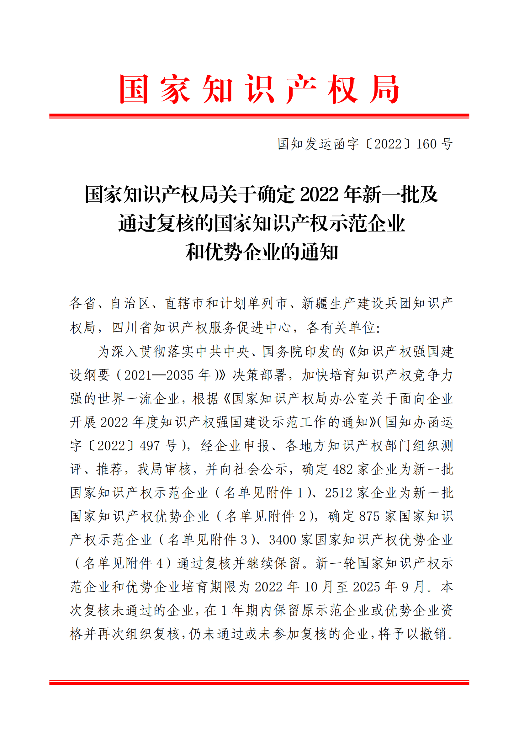 国家知识产权优势企业是知识产权领域最高荣誉之一,旨在培育一批知识产权质量高、知识产权保护和运用能力强、知识产权市场竞争优势初步形成,具有区域影响力的知识产权强企。